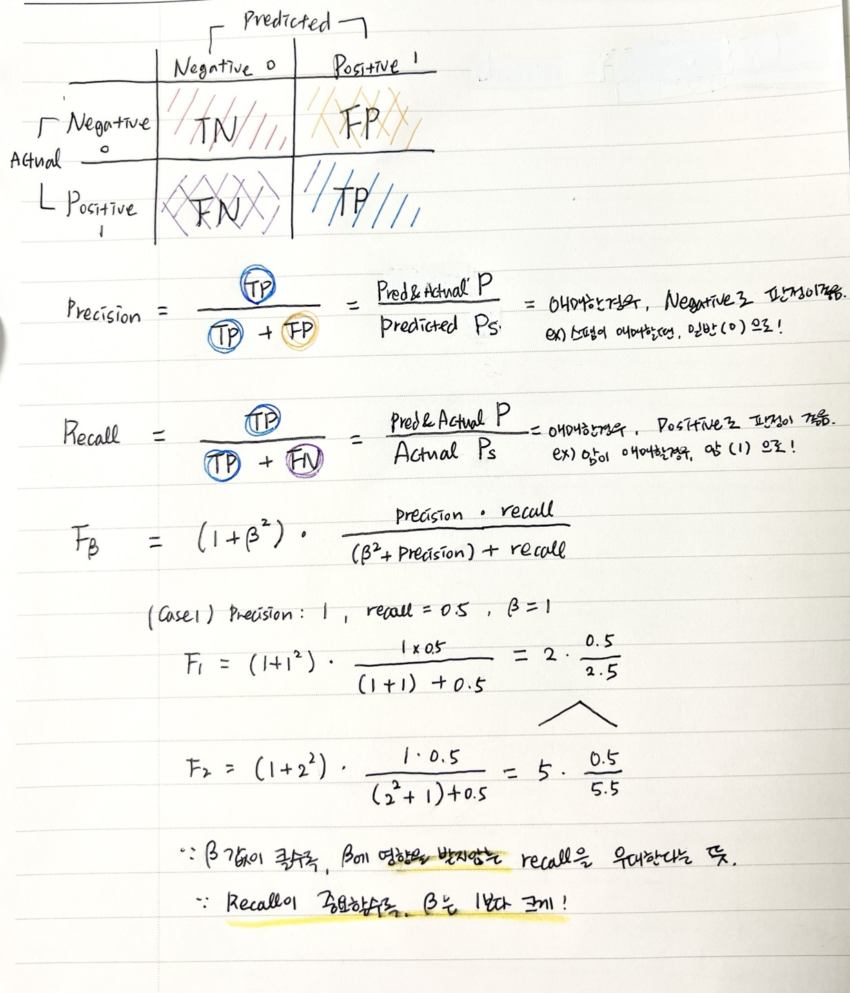 - 일단, precision과 Recall의 값은 클수록 정확하다는 뜻. TP가 많고, 각각의 FP나 FN이 작다는 뜻이므로.