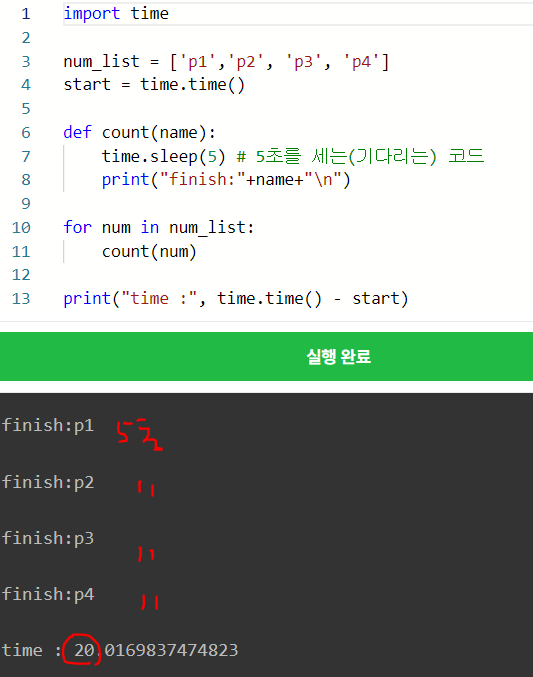 - 작업을 두 쪽으로 나눠서 하다보니 5초만에 결과가 두개씩 나와 10초가 걸렸다.