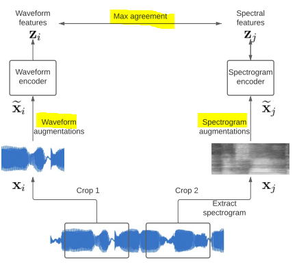 Raw audio data와 해당 스펙트럼 (spectrograms, log-mel, and MFCCs) 간의 일치를 최대화하여 오디오 표현을 학습을 위해 contrastive learning을 사용함. 하나의 스펙트럼으로 교육한 것 보다 여러개의 스펙트럼으로 교육한 것이 더 분류도 잘하고, 사운드의 특징도 잘 잡아냈다는 결론.