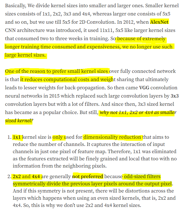 3. Big filter size는 weight가 많아 연산속도를 느리게 하기 때문에 small size를 선호.