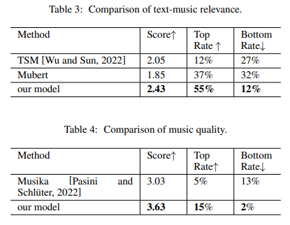 기존의 모델 3개 TSM, Mubert, Musika와 비교하였음.
