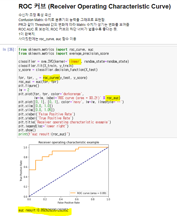 - 그래서 커브 아랫쪽의 너비값 AUC (Area Under Curve) 를 계산하여 성능을 평가. 1일수록 좋음