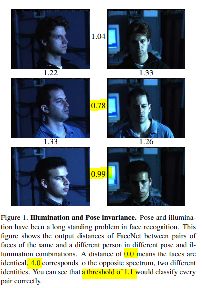 - Verification : 그냥 거리에 threshold 값을 넣어서 구분. 여기서는 1.1을 기준으로, 그 이하면 동일인물로 가려냄.
