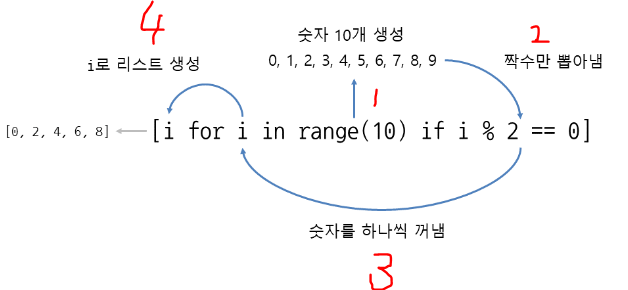 >>> a = [i for i in range(10) if i % 2 == 0] # 0~9 숫자 중 2의 배수인 숫자(짝수)로 리스트 생성
