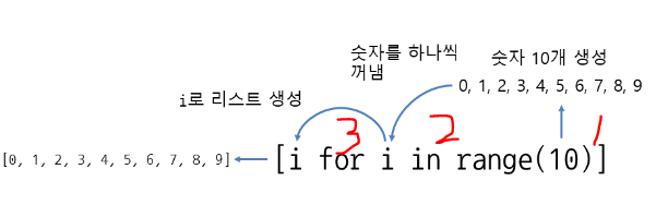 >>> a = [i for i in range(10)] # 0부터 9까지 숫자를 생성하여 리스트 생성