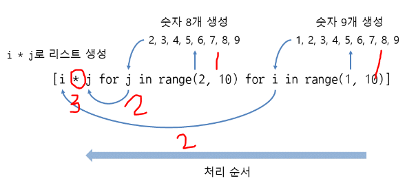 a = [i * j for j in range(2, 10) # 2부터 9까지 나오고