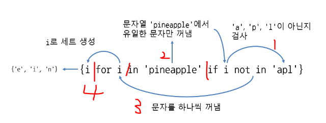 >>> a = {i for i in 'pineapple' if i not in 'apl'}
