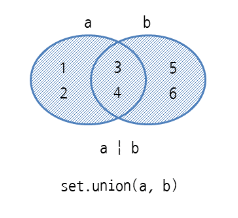 - set.union(세트1, 세트2) : 합집합 {1,2,3,4,5,6}